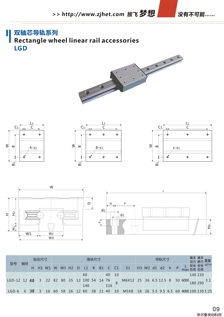 產品規格:LGD6, LGD8,LGD12, LGD16 LGD6: 軌寬26,滑塊寬60,總高30,軸芯直徑6, 整支長為4米,超過可進行超長對接, LGD8: 軌寬28, 滑塊寬60,總高30,軸芯直徑8, 整支長為4米,超過可進行超長對接, LGD12: 軌寬36,滑塊寬82,總高40,軸芯直徑12, 整支長為6米,超過可進行超長對接, LGD16: 軌寬50,滑塊寬120,總高50,軸芯直徑16, 整支長為4米,超過可進行超長對接, 產品特點: 1、耐蝕性及防銹性:雙軸心式滑軌之滑塊,軸心支持座,材質為鋁合金,加工后表面經陽極處理,不僅外型美觀且具耐蝕性,再加上軸心鍍硬鉻不生銹故具有優異的防銹效果。