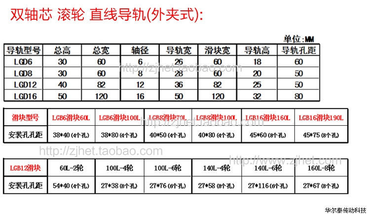 | 產品名稱:外置雙軸芯滾輪直線導軌(LGD系列 外夾式) 產品組成:鋁合金滑臺+碳鋼軸芯組成